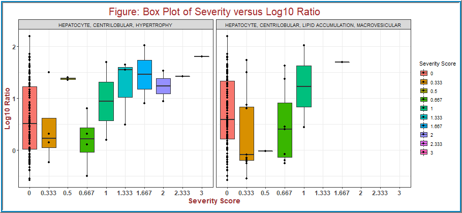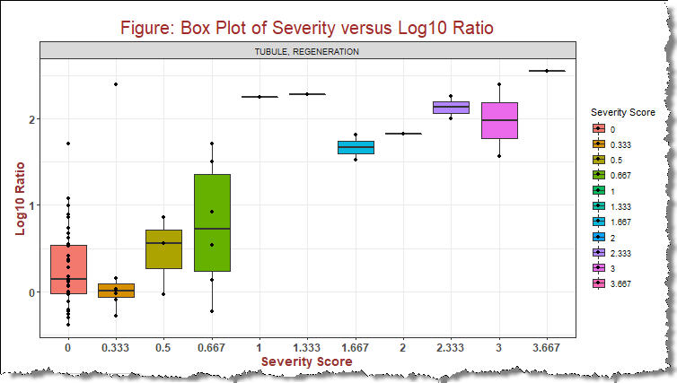 To illustrate this, here is an example. If you look at the histopathology TUBULE REGENERATION in Genes to Pathology tab, the boxplots are created to compare the chemical compound treatments with zero severity scores versus the