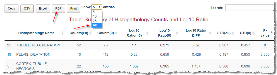 Once you see the top row displayed in the Summary table, you may click on the pathology name, e.g. TUBULE, REGENERATION. You will see all the experiments associated with the choice in detail shown in the table under the Summary table. In the meantime, a box plot with overlaying scatter plot shows at the bottom of the main panel.